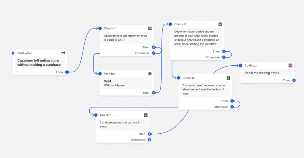 Shopflow Implementation refers to the technical process of building the automations. We create the triggers (e.g., ‘customer abandons cart’) and actions (e.g., ‘send email #1’) directly within your marketing platform (like Klaviyo) or using tools like Shopify Flow.